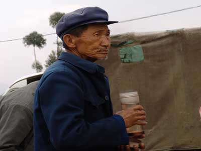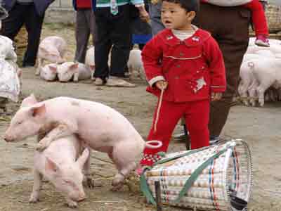 This old man drinks his Chinese tea while deciding which pig / cow / dog to buy for dinner.