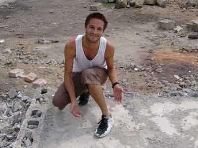Photo boy Jason can't get enough of temples even if it means putting his feet in wet white plaster. This plaster was conveniently dumped out the front of the temple.... did we mention no ones cleans in China?