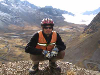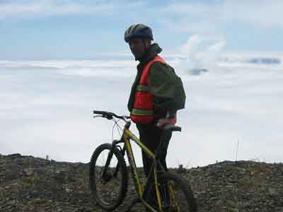 Here he is looking out over the layer of cloud at about 3,000m that was soon to engulf us and make the most dangerous road a blind bike ride.