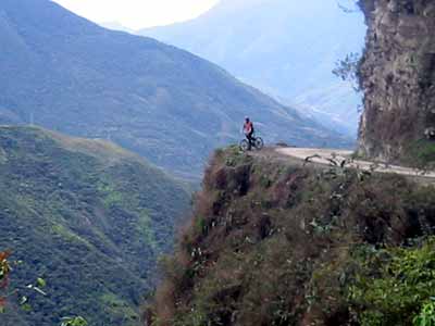 The old road between La Paz and Coroico has been officially named the Worlds most dangerous road. An average of 26 vehicles disappear over the edge of this road every year. The gravel track is often just over a truck-width wide, with a sheer drop of over 1000 metres in places. There are hulking rock over hangs and waterfalls falling onto the road itself.