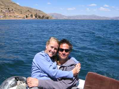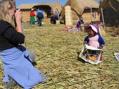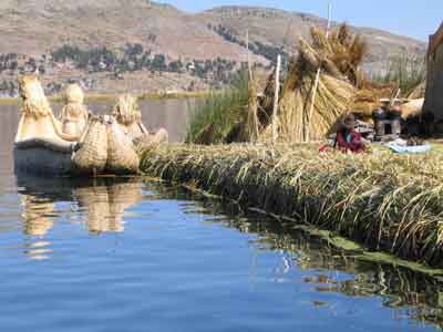 The bright-green duckweed that sits on the lake around Puno made it look more like a bowling green than a lake. Once out of the bay, we hit normal waters that took us to the floating islands of the Uros Indians.